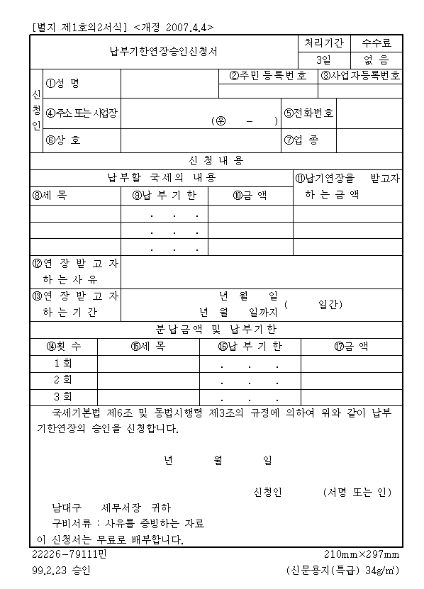 카테고리 없음 [서시받기] 부가세등 국세 납부기한연장승인신청서 by 아프로디테3 2023. 1. 19. 반응형 1. 부가세등 국세 납부기한연장승인신청서 2.서식받기 부가세등 국세 납부기한연장승인신청서.hwp 0.01MB 반응형 공유하기 게시글 관리 아프로디테의[서식백과사전] 저작자표시 비영리 변경금지 (새창열림) 댓글
