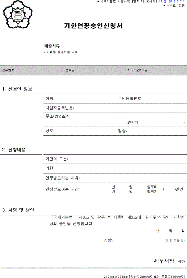 이는 천재지변 기타 사정으로 인하여 기간 내에 납부하는 것이 곤란한 자가 관할 세무서장에게 납부기한의 연장 승인을 신청하는 민원입니다.
