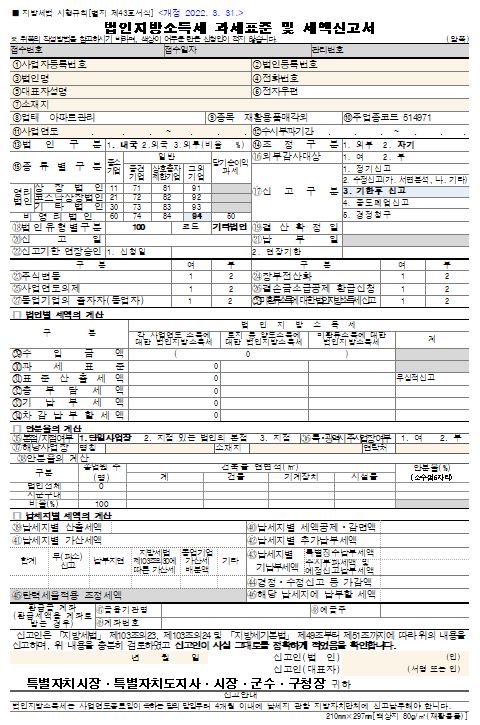 기본 신고서식에는 1. 법인지방소득세 과세표준 및 세액신고서 2. 법인지방소득세 과세표준 및 세액조정계산서 3. 재무제표 입니다.