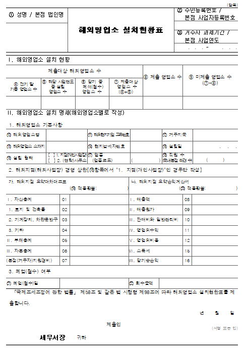 3월 법인세 신고 시에 해외 현지법인이 있다면 해외현지법인 명세서, 현지법인 재무상황표, 해외영업소 설치현황표를 작성하여 신고하여야 합니다. 미제출 시 가산세가 있습니다.