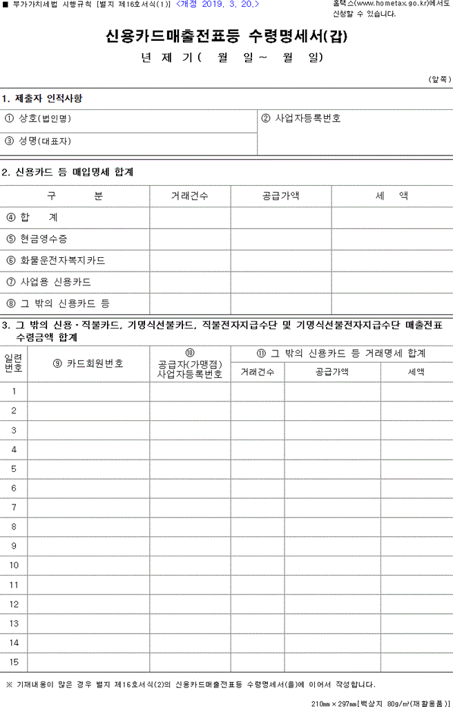 카테고리 없음 신용카드매출전표등 수령명세서 by 아프로디테3 2022. 12. 31. 반응형 1. 신용카드매출전표등 수령명세서 2.서식 신용카드매출전표등 수령명세서.hwp 0.02MB 반응형 공유하기 게시글 관리 아프로디테의[서식백과사전] 저작자표시 비영리 변경금지 (새창열림) 댓글