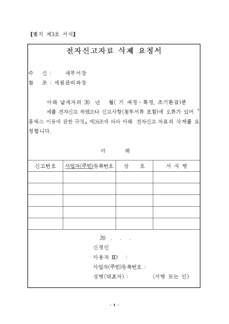 카테고리 없음 전자신고자료 삭제요청서 by 아프로디테3 2022. 12. 31. 반응형 1. 전자신고자료 삭제요청서 2. 서식 전자신고자료 삭제요청서.hwp 0.01MB 반응형 공유하기 게시글 관리 아프로디테의[서식백과사전] 저작자표시 비영리 변경금지 (새창열림) 댓글